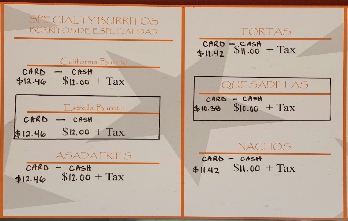 The menu features a variety of tacos—from crispy fish to tender lengua and carnitas—that highlight traditional preparations alongside inventive twists. Specialty burritos like the California Burrito and Estrella Burrito provide hearty, filling options for those seeking something a bit more substantial. Sides such as asada fries and nachos offer a shareable, indulgent touch to round out your meal.